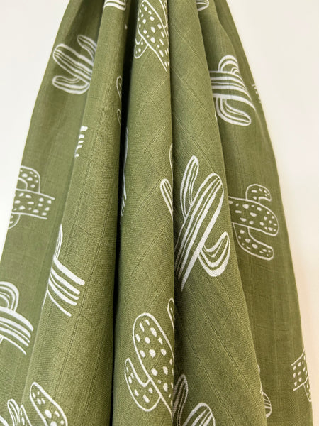 Expertly crafted with a blend of 70% bamboo and 30% cotton, this multiuse muslin wrap boasts breathability and a gorgeous olive green cactus  design. Perfect for swaddling, nursing, and more, this wrap provides comfort and versatility for you and your little one. Generous size 120cm x 110cm.